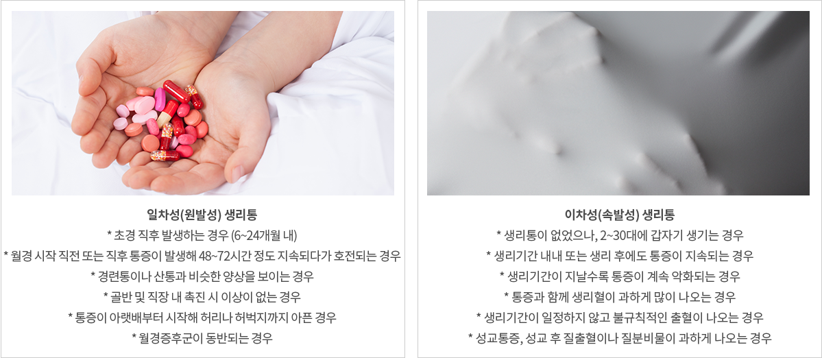 두꺼워진 자궁 내막이 탈락할 때 염증성 물질이 분비되면서 발생하는 현상으로 대부분의 생리통은 일차성 생리통으로 초경 때부터 특별한 원인이 없이 시작되어 나이가 들거나 출산을 하며 없어지는 경우도 있습니다.하지만 통증의 정도가 매우 심하거나 없던 생리통이 갑자기 생길 시에는 이차성 생리통을 의심해 볼 수 있으므로 진료 후 검사를 통해 확인하는 것이 중요합니다.